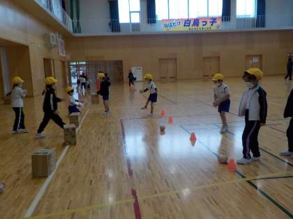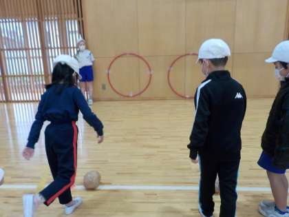今日の体育はボールをまとに向かって蹴りました。「今日は連続で当てられたよ」「なかなか思うようにボールが進まなくて難しかったな」と話す子供たちでした。