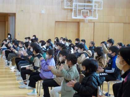 子供たちと物語を作りながら、演奏を聴くコーナーです。物語に出てくる主人公の名前を、みんなで付けるところから始まります。途中で手や足でリズム打ちをしたり、最後に「おーっ」と手を挙げたりしながら、演奏を楽しみました。