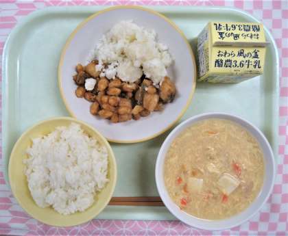 【献立】 ・ごはん ・牛乳 ・魚と大豆のねぎソースからめ ・こふきいも ・かきたま汁