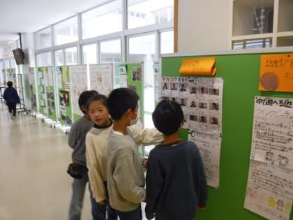 児童玄関に置いてある掲示板に、「学校紹介ポスター」「遊び紹介ポスター」がはってあります。6年生の子供が作成したものです。下級生が見入っていました。