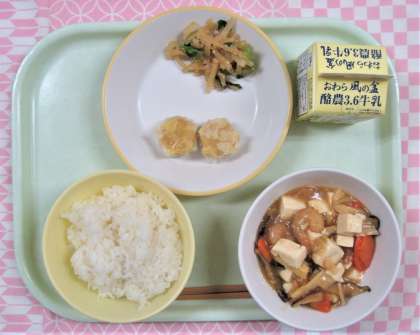 【献立】 ・ごはん ・牛乳 ・えびと豆腐のうま煮 ・にんじんシューマイ ・大根ナムル