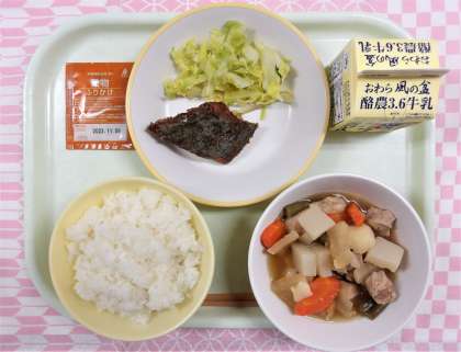 〜今日の給食 1月16日(月)〜 公開日 2023/01/16 更新日 2023/01/16 職員室より 【献立】 ・ごはん ・牛乳 ・魚のえごまだれ ・ゆでキャベツ ・大根と豚肉の煮込み ・穀物ふりかけ
