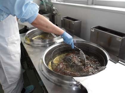 全校児童分が終わるまで、長い間ずっと揚げ続けるのでとても大変な作業ですが、みなさんに喜んでもらうために、調理員さんが頑張ってくださいました。
