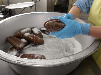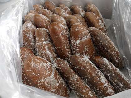 「揚げパン」は、コッペパンを200度の油で短時間揚げ、熱いうちにグラニュー糖をまぶして作ります。