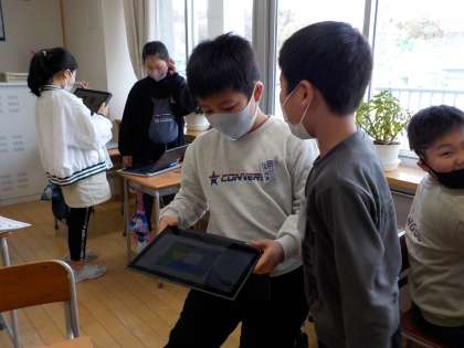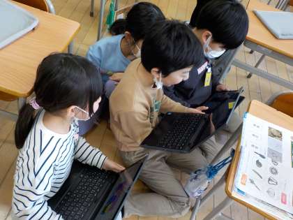 久しぶりの外国語活動!クロムブックを使ってクイズ作りをしました。自分の好きなキャラクターや動物の写真の一部を、○や△などの図形で隠して、クイズを作りました。