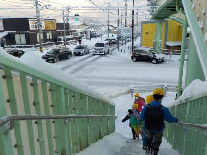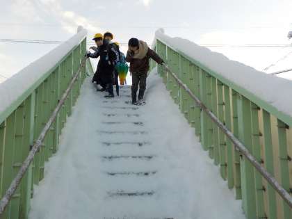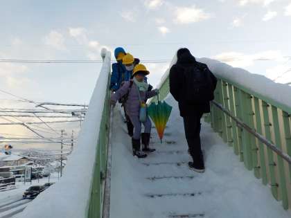 写真は、歩道橋を歩く白鳥っ子の様子です。