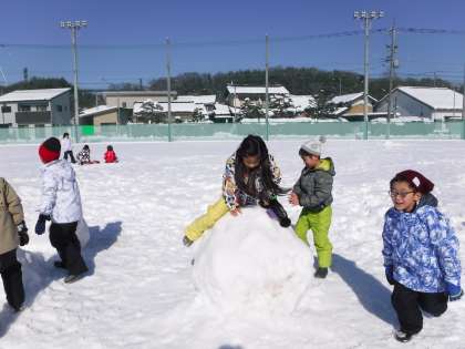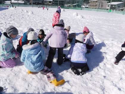 雪遊び後半には、それぞれ雪を使って自由に遊びました。雪のかたまりで跳び箱のようにして跳んだり、みんなで雪だるまを作ったりする姿が見られました。