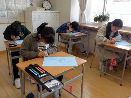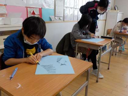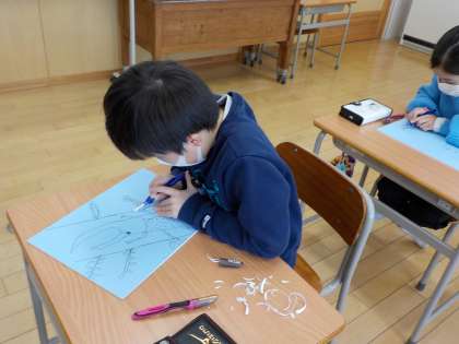 先週、彫刻刀を使う練習をしたこともあり、スムースに掘り進めていました。初めての彫刻刀。集中して、楽しくがんばっています!