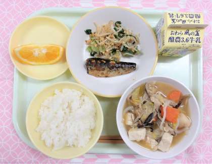 【献立】 ・ごはん ・牛乳 ・ちゃんこ鍋 ・いわしのピリ辛煮 ・炒り大豆和え ・いよかん