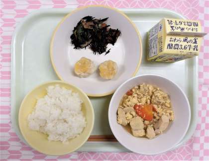 【献立】 ・ごはん ・牛乳 ・にんじんシューマイ ・ひじきと小松菜の炒め煮 ・高野豆腐の卵とじ