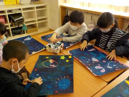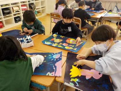 シール版画に挑戦しています。インクを塗った後に、シールをはがしてみると、カラフルな絵が出てきました。「きれいだね」「すごいね」など、友達と嬉しそうに話していました。