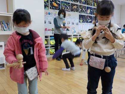1年生の生活科では、昔からの遊びに挑戦しています。こまやけん玉、お手玉等、友達と教え合いながら遊びました。こまを下敷きの上に乗せたり、お手玉を2つから3つに増やしたりするなど、いろいろな遊び方を試す姿が見られました。