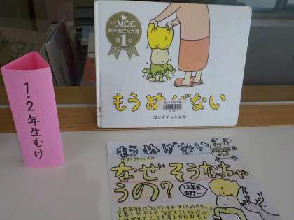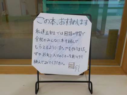 下級生に読んでほしい本を選び、本を推薦するポップを作りました。推薦したい学年に合わせ、分かりやすい言葉を選んだりイラストを入れたりする等、書き方を工夫しました。できたポップは、本と共に図書室前に置いてあります。