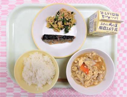 【献立】 ・ごはん ・牛乳 ・いわしのおろし煮 ・納豆和え ・卵とじ