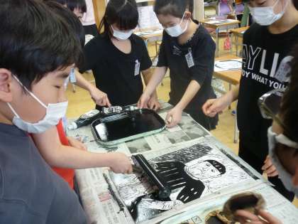 版画の「刷り」の作業を行いました。一人ではできないことも多いので、仲間同士協力して、がんばりました。どの作品も素晴らしい仕上がりになりました。