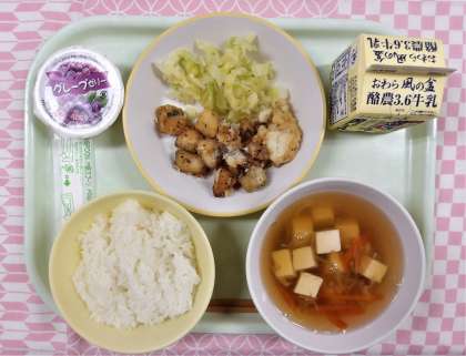 〜今日の給食 3月13日(月)〜 公開日 2023/03/13 更新日 2023/03/13 職員室より 【献立】 ・ごはん ・牛乳 ・魚とじゃがいものえごまみそからめ ・ゆでキャベツ ・すまし汁 ・ぶどうゼリー