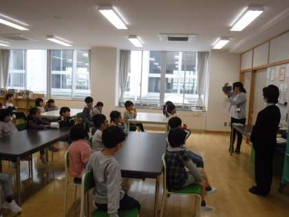 図書館司書の先生から本の貸し出しの方法や、図書室を使うときの約束を教えてもらいました。本を読むことが好きな子もたくさんいるようです。