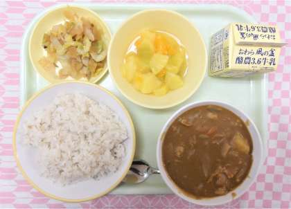 【献立】 ・麦ごはん ・牛乳 ・カレーライス ・福神和え ・フルーツゼリーミックス