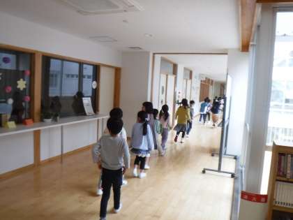 4月24日(月)1年生の様子です。上は、1組が図書室を利用した帰りの様子です。静かに1列に並び、歩いて教室に戻っているところがいいですね。