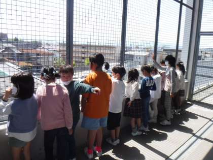 4月28日(金)3年生は、社会科の学習で、学校の周りの様子をベランダから観察していました。方位磁針を持ち、方角を確認しながら建物を見付けていました。