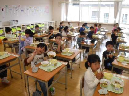 4月28日(金)今日の給食献立は、一足先に端午の節句にちなんだメニューでした。低学年に人気だったのは、やはり「こいのぼりハンバーグ」です。甘い柏餅も嬉しそうに頬張っていました。