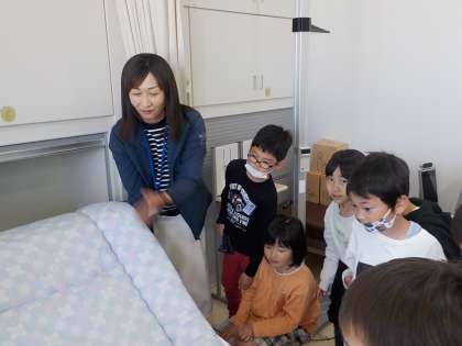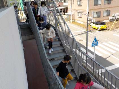 クラス単位で学校探検をしています。保健室の中の様子をじっくりと見せてもらったり、避難経路に使われる外階段を歩いてみたりしました。