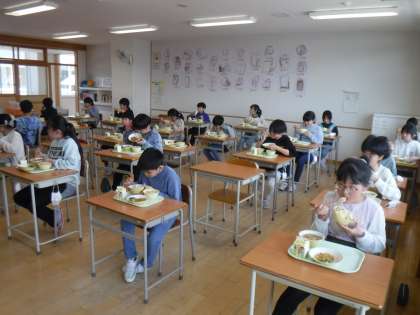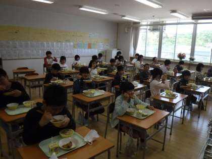 5月1日(月)の給食風景です。4年生は、おおかどそうめんじるが人気で、かき揚げを入れて食べている子もいました。