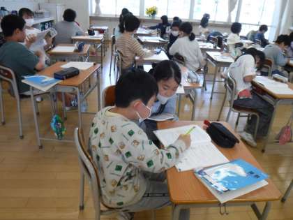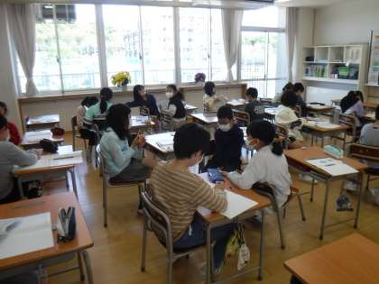 5月2日(火)4年生は、算数の学習で折れ線グラフから分かることを勉強していました。ペアやグループでお互いの考えを交流し合い、その後全体で意見の共有していました。落ち着いて学んでいます。