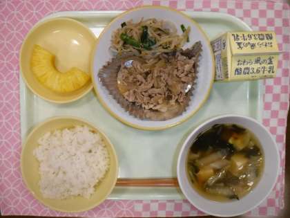 【献立】 ・ごはん ・牛乳 ・豚肉の生姜焼き ・ナムル ・中華スープ ・パインアップル