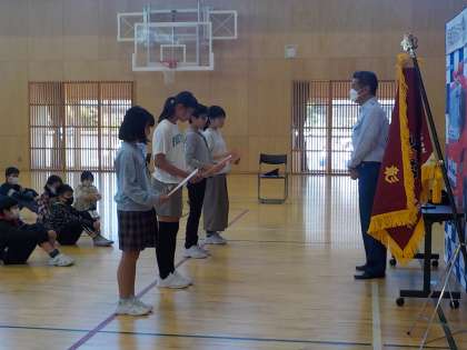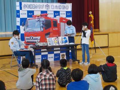 富山消防署から少年消防クラブのバッジを授与していただきました。また、防災のお話を聴いたり、119番通報の体験をしたりしました。白鳥っ子の防災リーダーとしての自覚をもち、一生懸命取り組もうとしています。