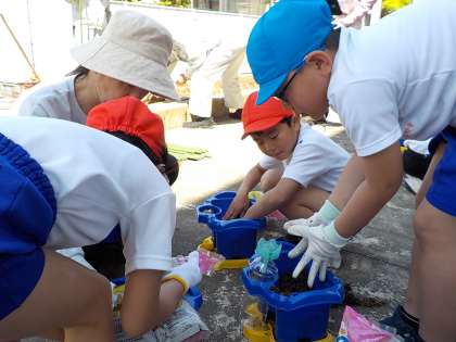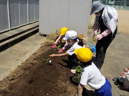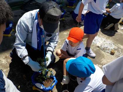 2年生の生活科では、野菜の苗を植えました。地域の野菜作り名人の協力を得て、支柱の立て方やひもの結び方など、丁寧に教えていただきました。