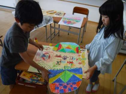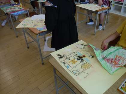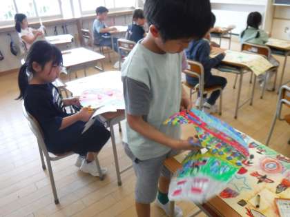 5月18日(木)2年生は、図画工作科の「たまごの中から」の続きを行っていました。以前画用紙の背景を描き、今日はいよいよ前に描いていたたまごを切って(割って)背景と組み合わせていました。たまごの切り方と置き方にこだわりがあるようです。