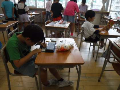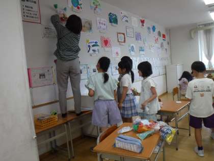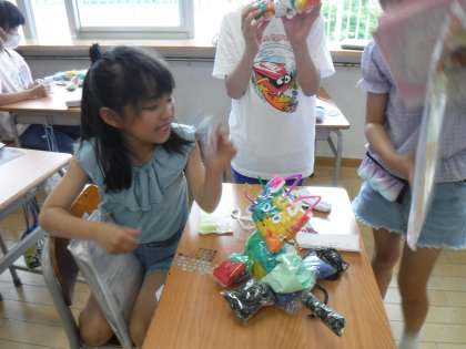 6月6日(火)3年生は、図画工作科で作品を作っていました。完成した作品に名札を付けたり友達と見せ合いっこをしたりして、お互いの作品を紹介しています。