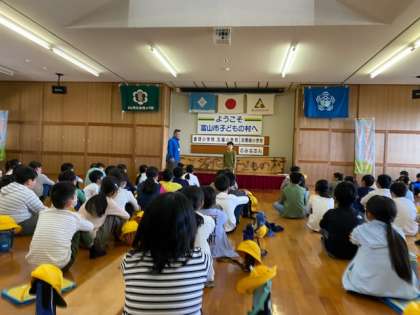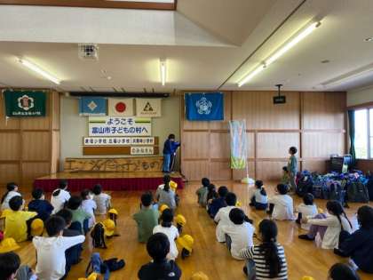 5年生宿泊学習入所式です。校旗を揚げ、集中してお話を聞いています。代表の挨拶もしっかり言えました。