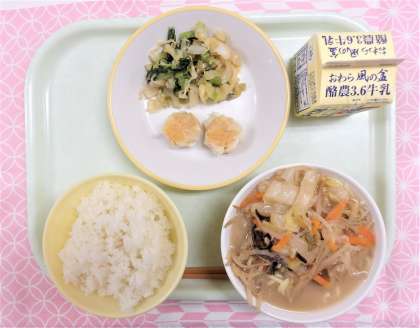 【献立】 ・ごはん ・牛乳 ・にんじんシューマイ ・しょうがひたし ・豚骨ラーメン