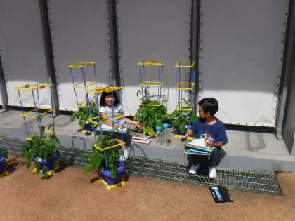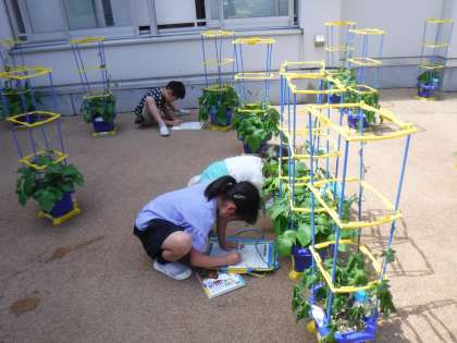 6月20日(火)1年生は、教室前の広場に出て、アサガオの観察を行っていました。随分大きくなって、つるも伸びてきています。思い思いの絵にして、大切にしている1年生です。