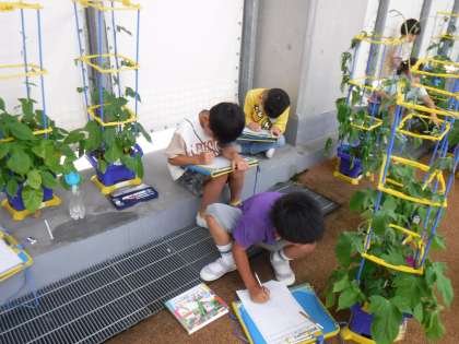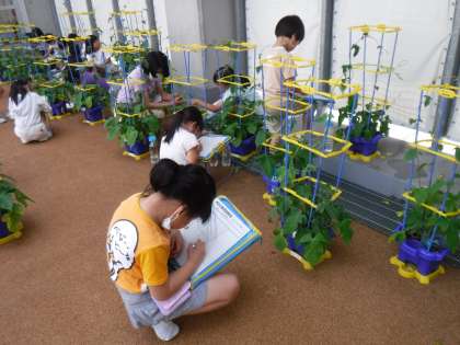 6月27日(火)1年生は、生活科の学習でアサガオの観察を行いました。随分つるが伸び、中には花も咲いています。じっくり観察して、つるの巻き具合や葉の形・毛まで描き表そうと頑張っています。