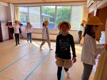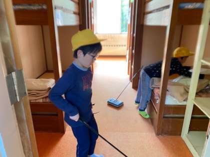 4年生宿泊学習、朝食後、お世話になった部屋や施設をきれいに掃除や片付けをします。テキパキと働く4年生です。