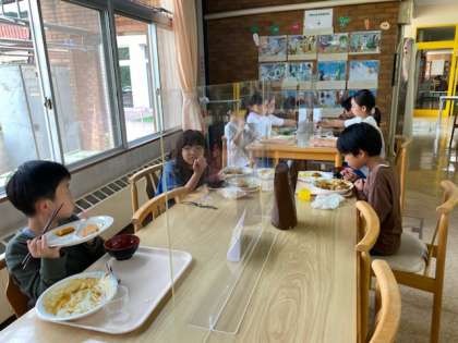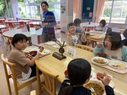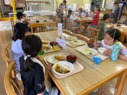 4年生宿泊学習、呉羽青少年自然の家で最後の昼食です。時間もたっぷりあり、ゆっくりカレーライス等を食べました。ドリンクバーが大人気でした。