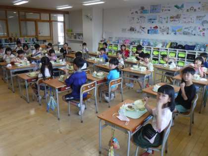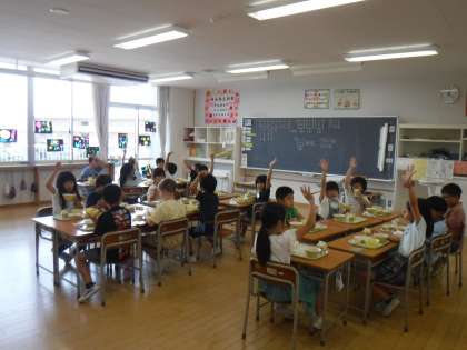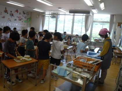 7月3日(月)今日の給食は選択献立でした。事前におかずとデザート2種類の内から、好きな物を選んでいました。おかずは、肉が人気でしたが、魚フライも結構いました。デザートは、クリームソーダーゼリーが五福小学校では大人気でした。