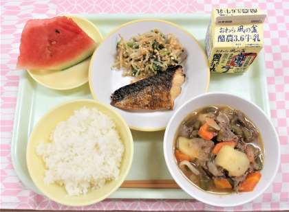 【献立】 ・ごはん ・牛乳 ・肉じゃが ・さばの塩焼き ・いり大豆和え ・すいか