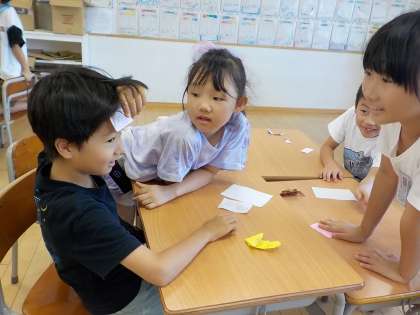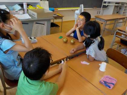 友達の出し物を真剣に見たり、班の友達と楽しくゲームしたりする子供たちの様子です。