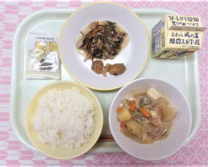 【献立】 ・ごはん ・牛乳 ・ほたての香味焼き ・もずくのチャプチェ ・ごまけんちん ・黒糖大豆