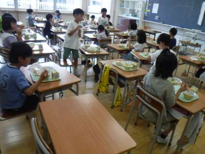 9月5日(火)1・2年生の給食の様子です。今日の献立は、子供たちに大人気。