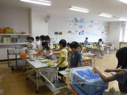 下の写真は、1年生の給食終わりの様子です。しっかりと片付けをしたりきれいに歯磨きをしたりしています。2学期も頑張っています。