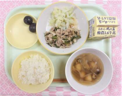 【献立】 ・ごはん ・牛乳 ・豚キムチ丼 ・ゆでキャベツ ・茎わかめスープ ・巨峰