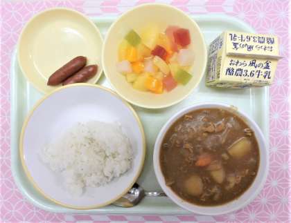 【献立】 ・ごはん ・牛乳 ・カレーライス ・あらびきウインナー ・フルーツカクテル