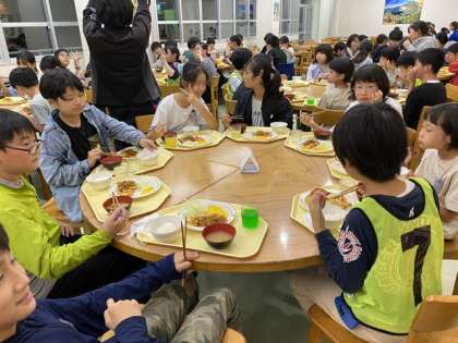 国少での夕飯です。バイキングで、バランスよく食べています。中には、お腹が空いて、おかわりする人もいました。みんな元気です!