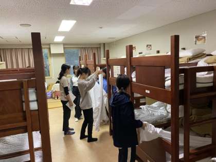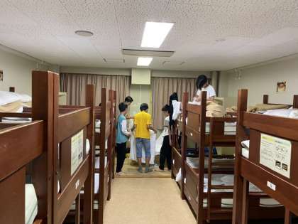 6年生宿泊学習2日目です。みんな元気に起き、ベッドのシーツや毛布などをきちんと整えています。