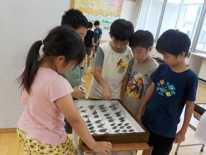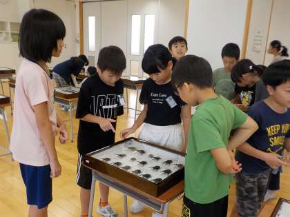 クワガタ博士の澤田さんが、今年もたくさんのクワガタの標本を持ってきてくださいました。「これ、めっちゃ小さいよ。」「どうやって標本をつくったんだろう。」と、子供たちは興味津々でクワガタの標本を観察していました。